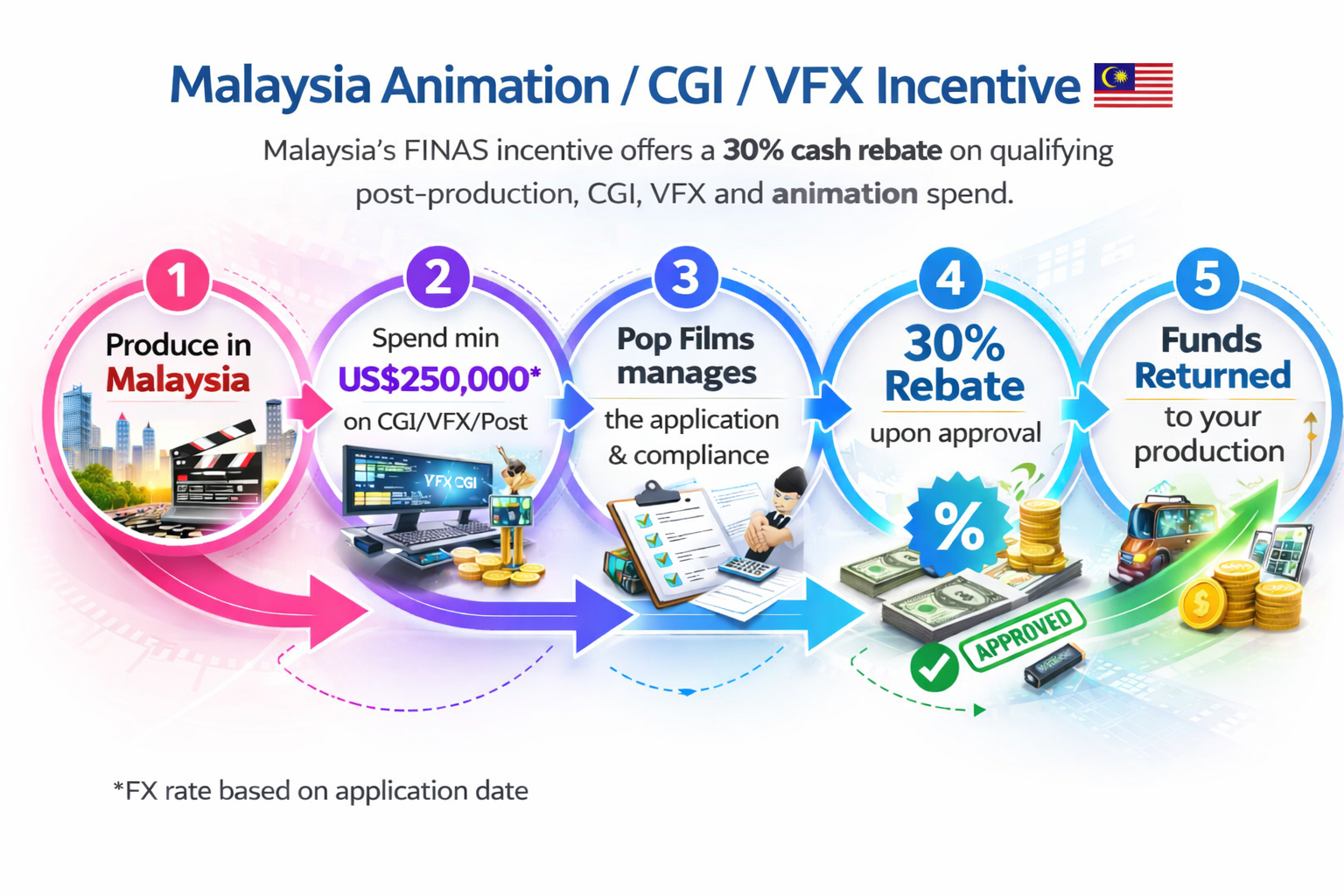To qualify, productions must incur a minimum local spend of approximately US$250K equivalent in Malaysia for post-production work. The rebate is calculated based on qualifying Malaysian production expenditure for services carried out locally.